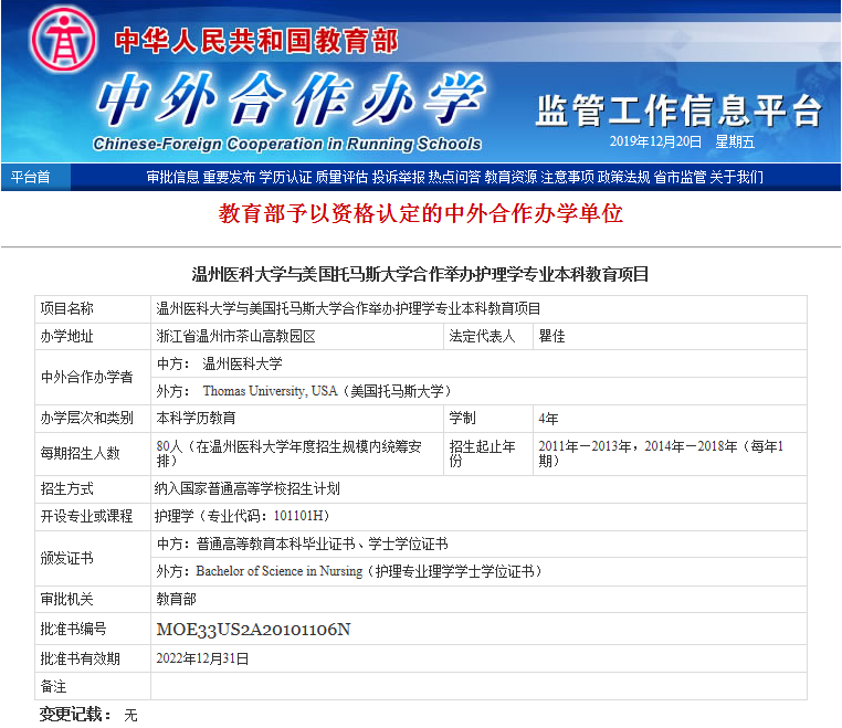 温州医科大学与托马斯大学合作办学项目中国教育部批文