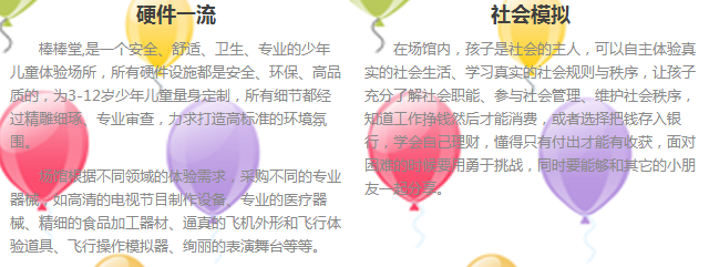 帅气的民航客机驾驶员,靓丽的空中小姐,还有亲切而威严的安检警官,这里俨然是一座航空港。帅气的驾驶员驾驶飞机的基本要求是什么?飞机飞行过程中遇到紧急状况时又该怎么办?靓丽空姐的基本礼仪是什么?乘坐飞机又有那些小常识是你不知道的?加入棒棒堂航空公司吧,在这里你不仅可以学习到这些知识,还可以实现你的飞行梦,快快加入棒棒堂航空公司吧!让孩子了解航空公司的职责和功能,通过职业体验,感受机长和乘务员的工作过程,同时能体会到坐飞机的真是感觉。