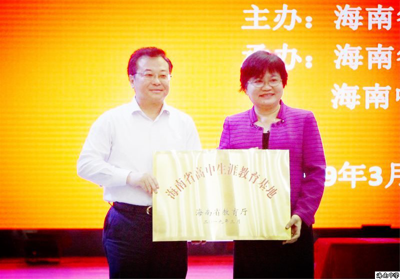 随后举行了海南省生涯教育基地学校挂牌仪式。李燕仪副厅长代表教育厅为海南中学授牌,马向阳校长代表学校接受了牌匾。这标志着海南中学成为省内第一所生涯教育基地学校。