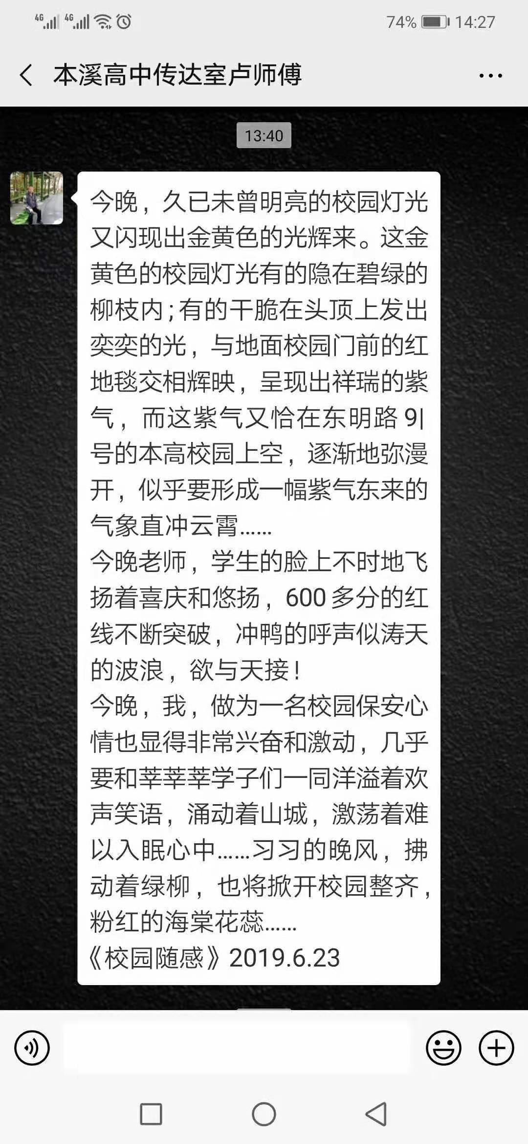 当天晚上他陪伴着我们所有的老师,一直在学校等候孩子们的成绩,高考成绩揭晓后,他第一时间分享了最美成绩单的喜悦,然后自己就写了一篇小文章,发给了关注我们学校的摄影师卫爱民老师。