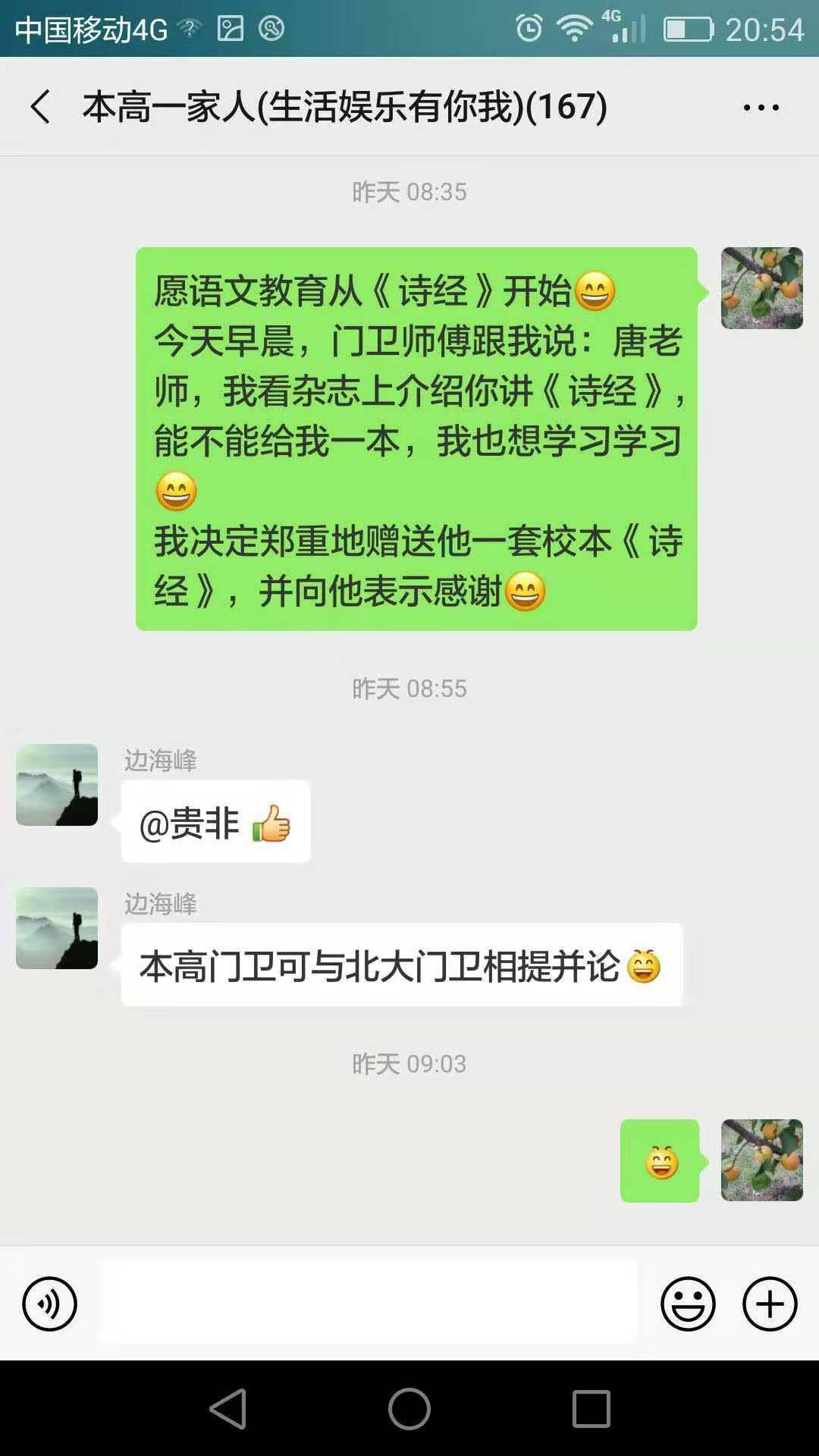 由此,我们在群里分享这篇文章的时候,才知道这是一个有情怀的,愿意读诗经的本高门卫。