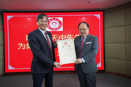 近日,美国库克大学黄天中教授受聘为我校客座教授,我校副校长曹敏杰为黄天中颁发了聘书。美国库克大学校长Amy Storey、副校长Fuster、副校长Petrie、中国总校区校长Joseph Hwang、库克中国合作院校领导以及我校海外教育学院领导出席了客座教授聘任仪式。